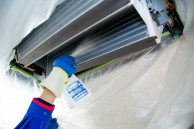 4:養生した本体を、専用機材とエアコン用オリジナル洗浄剤で徹底的に洗浄します。